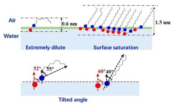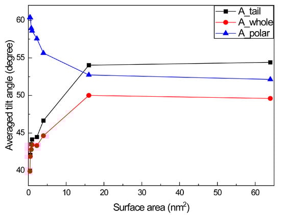 From Figure 4, we can see that A_Tail and A_Whole increase as away from the water phase surface area increases. This is reasonable because fewer NDB molecules are absorbed at the vapor–water interface at a large surface area. With the increasement of surface area, a larger extending space among NDB molecules exists and the preference of away from the water phase NDB molecule and alkyl chain to the interface also increases. A singly absorbed NDB molecule at the interface (64 nm2) can have the largest extending space, making whole molecule and tail chain incline to the interface. In comparison, the angle change is small (<5°) when the surface area is small. This is similar to experimental results that indicate the tilted angle hardly changes with the change of surface concentration []. At a very large surface area (corresponding to extremely dilute solution), the angle rises ca. 10°. On the contrary, A_Polar decreases with the increase in surface area, showing an opposite trend with A_Tail and A_Whole. This opposite trend may be related to the more alkyl chain lying on the interface at a large surface area. The deflection of the tail chain will also deflect with the polar head, which makes the angle between the polar head and Z-direction smaller. Since the arrangement of the polar head and tail chain has mutual affect, the angle distribution of the overall molecule is slightly lower than that of the tail chain. In comparison, A_Polar angles are larger than A_Tail and A_Whole angles at small surface area (<16 nm2), indicating that the tail chain has a larger tendency to surface normal than the polar head. From 16 nm2, the A_Tail angle begins to be larger than the A_Polar angle. When the surface coverage is low, the NDB polar head prefers to surface normal more than the tail chain. The change of surface coverage has different effects on the inclination of NDB polar heads and alkyl chain at the air–water interface.