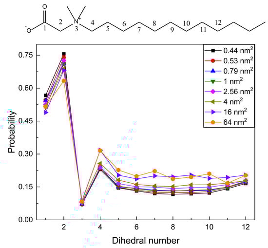 The distribution of dihedral conformations can be well described by the probability of gauche defects. A dihedral angle that deviates from 180° exceeding 60° is defined as a gauche angle. Twelve dihedral angles are defined and calculated. As shown in the mark at the top of Figure 5, mark 1 is defined as a CCNC dihedral angle, and gradually, mark 12 is a CCCC dihedral angle at the end of the tail chain. All curves in Figure 5 have similar distribution trends. From dihedral 1 to 12, the gauche probabilities begin from ca. 0.5 to the highest value at dihedral 2, and the probability rapidly decreases to the lowest value (<0.1) at dihedral 3. For dihedral 4, it again increases. Then, the probability shows a U-shape distribution from dihedral 5 to dihedral 12 at surface areas less than 16 nm2. When the surface area is large for 16 and 64 nm2, the gauche probability reaches the approximate platform from dihedral 5. Until the last one (dihedral 12), it slightly increases. In detail, the gauche probabilities of dihedral 1 of all systems are around 0.5, which means that gauche and trans conformations account for half, respectively. For dihedral angle 2, gauche defects reach the highest value, showing that the proportion of gauche conformation is high and this chain section bends to a large extent. Dihedrals 1 and 2 are two dihedral angles including the polar head, and their gauche distributions slightly decrease with the increase in surface area. For dihedral 3, gauche defects decrease to about 0.08, which means that the trans conformation occupies a very high proportion. Interestingly, the probability of dihedral 3 hardly changes with the increase in surface area. Contrary to dihedrals related to polar head, the gauche defects of dihedrals 4–12 along the alkyl chain increase with the increase in surface area. For all systems, the gauche probabilities related to the polar head are larger than those with alkyl chains.