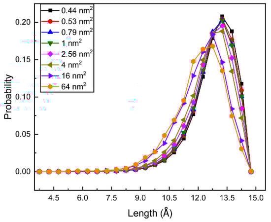 Gauche defects along the tail chain are related to the length of the alkyl chain. The higher the gauche defects, the shorter the chain length. The length distribution of the NDB chain is shown in Figure 6. With the increase in surface area, the distribution peak shifts to the decreasing direction of the tail length. This trend is in good agreement with the one of chain gauche distribution. When the NDB molecule has a small surface area, the interfacial monolayer is compact. The whole NDB molecule and alkyl chain have less of a chance of spreading on the air–water interface and will extend more uprightly, causing more trans-conformations and a longer alkyl chain.