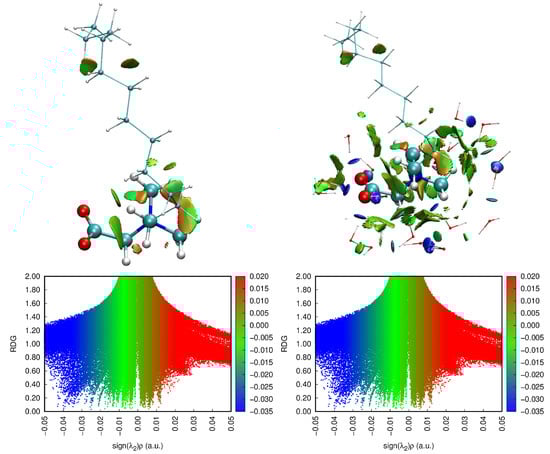The interactions between different components of the NDB molecule and the interactions between NDB and water molecules are analyzed with the method [] proposed by Johnson et al. The reduced density gradient function (RDG) is defined as []. As shown in Figure 7, red, green, and blue colors in the color bar represent the repulsion, van der Waals, and attractive interactions, respectively. The sign of λ2 is utilized to distinguish bonded (λ2 < 0) and nonbonded (λ2 > 0) interactions. The quantity sign(λ2)ρ represents the product of ρ and the sign of λ2, where λ2 is the second largest eigenvalue of the Hessian matrix of ρ. One or more spikes that appear in low-density and low-gradient regions indicate the existence of weak interactions. Figure 7 is generated with the Multiwfn 3.8 program [] and VMD 1.9.3 [].