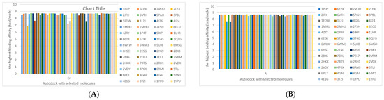 Comparison between the highest binding energy of the studied ligands and target receptor: (A) AutoDock of Cr with selected studied receptor; (B) AutoDock of Al with selected studied receptor; (C) AutoDock of Cd with selected studied receptor; (D) AutoDock of Pb with selected studied receptor.