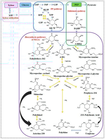 Peng J, Guo F, Liu S, Fang H, Xu Z, Wang T. Recent Advances and Future Prospects of Mycosporine-like Amino Acids. Molecules. 2023; 28(14):5588. https://doi.org/10.3390/molecules28145588