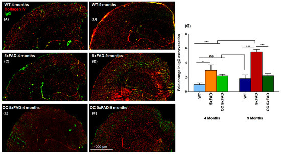 Representative brain sections stained with anti-mouse IgG antibody to detect IgG extravasation (green) and anti-collagen antibody (red) in mouse brain (A) WT-4-month-old, (B) WT-9-month-old, (C) 5xFAD-4-month-old, (D) 5xFAD-9-month-old, (E) 5xFAD-4-month-old treated with 10 mg/kg OC daily for 3 months, and (F) 5xFAD-9-month-old treated with 10 mg/kg OC daily for 3 months. (G) IgG optical density in mice brains was quantified for IgG extravasation. Data are presented as mean + SEM for n = 5 mice/group. ns for not significant, * p < 0.05, and *** p < 0.001 vs. WT-4 months WT mice. Scale bar, 1000 μm.