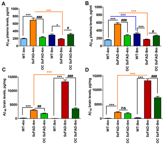 The effect of age, pathology, and 10 mg/kg OC treatment on levels of soluble plasma Aβ40 (A) and Aβ42 (B) and brain Aβ40 (C) and Aβ42 (D) as determined using ELISA in WT and 5xFAD mice. The statistical significance is color-coded with blue stars indicating the difference in WT with age, orange stars indicating the difference in 5xFAD mice with age, and black stars indicating the difference between WT and 5xFAD mice. Data are presented as mean ± SEM (n = 10/group). ns for not significant, * p < 0.05, *** p < 0.001, # p < 0.05, ## p < 0.01, and ### p < 0.001.