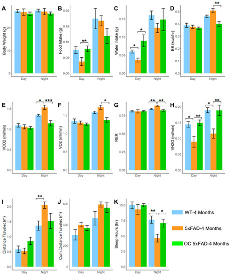 The effect of OC (10 mg/kg; PO) on the metabolic parameters (A) Body weight (g), (B) Food intake (g), (C) Water intake (g), (D) EE (kcal/h), (E) VCO2 (mL/min), (F) VO2 (mL/min), (G) RER, (H) VH2O (mL/min), (I) Distance traveled (m), (J) Cumulative (Cum.) distance traveled (m), and (K) Sleep hours (h) in 4-month-old WT and 5xFAD mice at daytime and nighttime. Data are presented as mean ± SEM for n = 10 mice/group. * p < 0.05, ** p < 0.01, and *** p < 0.001.
