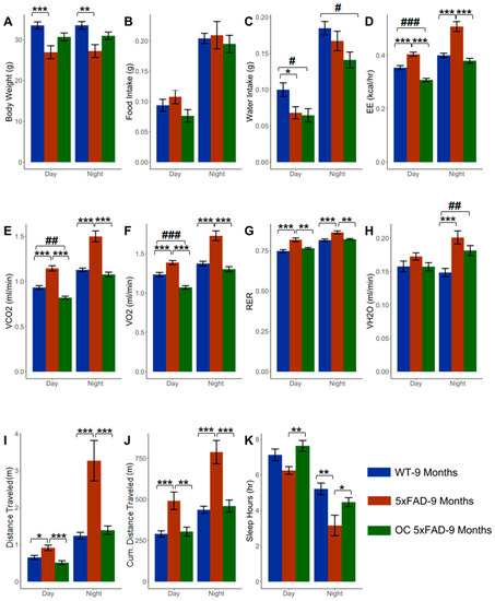 AD patients have lower body weight than cognitively normal individuals of the same age due to appetite and metabolic state changes [6,32]. In addition, dehydration is one of the symptoms induced in AD patients [33]. In our studies in mice, we observed that 5xFAD-9m mice have lower body weight than WT-9m, although food intake was the same in both strains. The reduced body weight at an older age could be related to the general increase in body metabolism represented by the increased dehydration rate (parameter VH2O), hyperventilation (parameters VO2, VCO2, and RER), activity rate (parameter EE), movement (traveled distance), and sleep disturbances, all of which could be associated with anxiety-like behavior in mice.