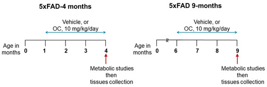 Male wild-type C57BL/6J (Strain #:000664) and 5xFAD (Strain #: 034848-JAX; both from Jackson Laboratory, Bar Harbor, ME, USA) mouse models were used in the studies at 4 and 9 months of age (n = 10 mice per group). In addition to these four groups, other two groups were added (n = 10 mice/group), namely, 5xFAD-4-month-old and 5xFAD-9-month-old that received 10 mg/kg OC by oral gavage daily for 3 months starting at the age of 1 and 6 months, respectively. WT and 5xFAD mice received saline (as a vehicle) by oral gavage. OC is an amphiphilic compound and is water soluble [54]. A schematic diagram of the experimental design is demonstrated in Scheme 1. The AD mouse model 5xFAD expresses human amyloid precursor protein (APP) with the mutations APP KM670/671NL (Swedish), APP I716V (Florida), APP V717I (London), and PSEN1 M146L and PSEN1 L286V, leading to early and aggressive Aβ accumulation associated with deficits in spatial learning as the disease progresses [55]. In 5xFAD mice, extracellular Aβ plaque deposition starts at 2 months with gliosis. This early Aβ deposition and gliosis induce synaptic loss, resulting in cognitive impairment at 4 months. Aged C57BL/6J mice are frequently used in studies related to neurodegenerative disorders. C57BL/6 mice demonstrate a decline in physical function as early as 6 months of age, while the cognitive function begins to decline later, with a considerable impairment present at 22 months of age [56]. WT and 5xFAD mice were housed for breeding in plastic containers under 12 h light/dark cycle, 22 °C, 35% relative humidity, and ad libitum access to water and food. At 4 and 9 months of age, mice were transferred to metabolic cages as described below to perform the metabolic and behavioral phenotypes assessments. All animal experiments and procedures were approved by the Institutional Animal Care and Use Committee of Auburn University and according to the National Institutes of Health Guidelines Principles of Laboratory Animal Care.
