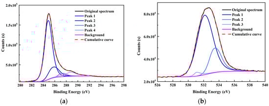 Besides carbon, heteroatoms such as O, N, and S were also included in the carbon structure. An XPS wide-scan spectrum is shown in Figure 2. It found that the carbon and oxygen peaks were distinct, indicating they were the major elements in the sample. Two weak peaks for nitrogen and sulfur peaks were also observed. The peak-fitting analyses for the four elements were performed using Avantage software. The results are shown in Figure 3. The forms and relative contents of these heteroatoms were analyzed according to the fitting results [10,19].