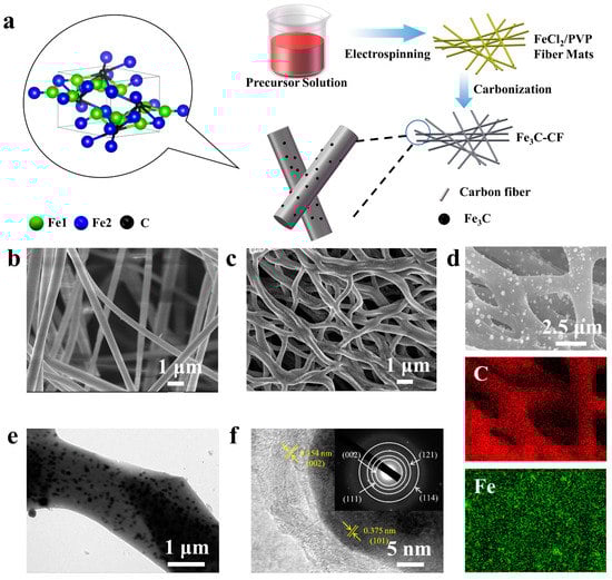 As shown on the SEM images and energy-dispersive X-ray spectra (EDS) patterns in Figure 1c,d and Figure S2a,b, Fe3C particles are uniformly distributed in the composite fibers; the pictures indicate that the size of Fe3C particles increased with the rise in temperature. Furthermore, the TEM image (Figure 1e) also illustrates that a great quantity of particles were distributed uniformly on the fibers, whose average size was about 70~150 nm. Linear scanning experiments were also carried out on the Fe3C-CF, which showed a sharp spike from the Fe element as the scanning rays passed through the particles (Figure S3). In the high-resolution transmission electron microscopy (HRTEM) image (Figure 1f), the lattice spacing of the particles is 0.375 nm, corresponding to the (101) plane of Fe3C, while the lattice spacing of the fiber edge is 3.354 nm, corresponding to the (002) plane of carbon fiber. The selected area electron diffraction (SAED) pattern inside Figure 1f indicates that the diffraction rings are well indexed to the (002), (111), (121), and (114) planes of Fe3C. The above experimental results show that Fe3C particles are successfully prepared and uniformly loaded on carbon fibers.