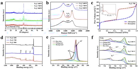 (a) X-ray diffraction (XRD) patterns of different Fe3C-CF samples; (b) Raman spectra of Fe3C-600, Fe3C-700, and Fe3C-800; (c) nitrogen adsorption/desorption isotherms, with the pore size distribution (inset) of Fe3C-700; (d) XPS survey spectra of Fe3C-600, Fe3C-700, and Fe3C-800; (e) XPS spectra (C1s) of Fe3C-700; (f) XPS spectra (Fe2p) of Fe3C-CF.