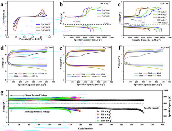 (a) Cyclic voltammetry curves (CV) for different cathodes at a scan rate of 0.15 mV s−1 within a voltage window of 2.35–4.35 V; (b) initial discharge/charge profiles of different catalytic electrodes at 2.35–4.5 V (c) Rate capability of Fe3C-700 electrode at different current densities; galvanostatic discharge/charge curves of (d) Fe3C-600, (e) Fe3C-700, and (f) Fe3C-800 within an upper-limited specific capacity of 600 mAh g−1 at a current density of 500 mA g−1; (g) comparison of galvanostatic discharge/charge cycles and corresponding terminal voltages of Fe3C-700 with an upper limited specific capacity of 600 mAh g−1 at a current density of 200 mA g−1, 500 mA g−1, 800 mA g−1 and 1000 mA g−1.