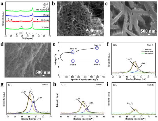 (a) XRD patterns at different discharge/charge stages; (b) SEM images of the Fe3C-700 cathode at the fresh stage; (c) the first cycle, full discharge; (d) the first cycle, full charge; (e) the first discharge–charge curve of the Fe3C-700 electrode at a current of 500 mA g−1 with an upper-limited capacity of 600 mAh g−1; high-resolution XPS spectra of the Li 1s core level of the Fe3C-700 electrode at different states corresponding to states (I~IV) in (f–i), respectively.