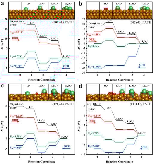Theoretically calculated energy diagrams of the ORR and OER processes of two paths on the different surfaces: (a) Li PATH process on (002); (b) O2 PATH process on (002); (c) Li PATH process on (121); (d) O2 PATH process on (121).