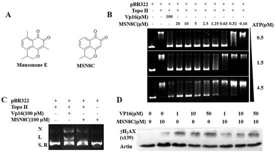 (A) The structures of mansonone E and MSN8C. (B) Results from experiments investigating the activity of MSN8C on Topo II-mediated DNA relaxation at different ATP concentrations. Row 1 is the pBR322 control; Row 2 is Topo II and pBR322; Row 3 is Topo II, pBR322 and 100 μM VP16; Row 4–11 is Topo II and pBR322 at the indicated MSN8C concentrations and at different ATP concentrations. (C) Effect of MSN8C on Topo II–DNA cleavage complex. Row 1 is Topo II and pBR322; Rows 2–3 are the cleavage activity assay of Topo II for compound VP16 and MSN8C at 100 μM, respectively. Row 4 is only pBR322 and MSN8C; N—nicked DNA, L—link DNA, R—relaxed DNA and S—supercoiled DNA are shown in the figure. (D) The expression of S139 phosphorylated histone H2AX (γH2AX) analyzed via Western blot.