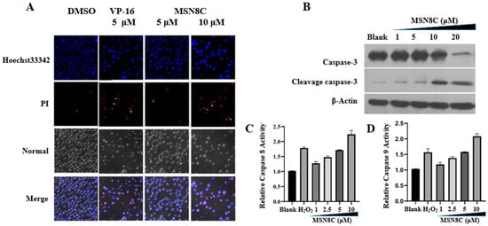 MSN8C-treated HL-60 cells were stained with Hoechst 33342 and propidium iodide (PI) prior to analysis. Figure 2A shows that cells in the control group had lower levels of Hoechst 33342 and very little PI staining, indicating intact cell morphology. When treated with VP-16 as a positive control at a concentration of 5 μM, cells absorbed more Hoechst dye and propidium iodide (PI) penetrated the nucleus, indicating incomplete cell morphology. Treatment with 5 μM MSN8C resulted in cells that had a brighter blue color than the control group, and at a concentration of 10 μM, cells showed similar characteristics to the positive control VP-16. We also identified that the expression of lysis caspases (-3, -8, -9), indicators of apoptosis, was significantly upregulated (Figure 2B) and their activity increased (Figure 2C,D) according to Western blot analysis and the caspase (-8, -9) activity assay kit after treatment with different concentrations of MSN8C for 24 h. These data suggest that MSN8C can induce cell apoptosis.