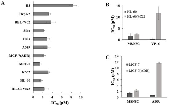 (A) IC50 values of MSN8C against cancer cells. Cancer cells were treated with the indicated concentration of MSN8C for 48 h. Cell proliferation was determined using the MTT assay; (B,C) a comparison of IC50 between MSN8C and VP-16/ADR in parental and drug-resistant cell lines.