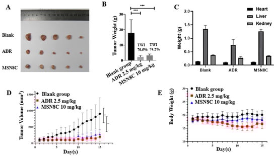 (A) Growth inhibition of MSN8C (10 mg/kg) and ADR (2.5 mg/kg) in human A549 nude mouse xenograft tumor model. (B) The tumor weight histograms of MSN8C and ADR. The TWI was calculated on the final day and compared with the blank group. All values are expressed as mean ± SD; *** p < 0.001 (Student’s t-test) indicates statistic difference. (C) Heart, liver and kidney weight of A549 nude mouse after 15 days of treatment with MSN8C and ADR. (D) Tumor volume of A549 nude mouse over 15 day of treatment with MSN8C and ADR. (E) Body weight of A549 nude mouse over 15 days of treatment with MSN8C and ADR.
