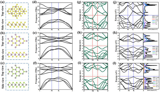 (a−c) show the optimized atomic structure (top view and side view), (d−f) phonon dispersion curve, (g−i) HSE06 projected band structures and state density of 1T-TaS2, 2H-MoS2, 2H -WSe2, respectively. (j−l) PBE projected band structures and state density of 1T-TaS2, 2H-MoS2, 2H -WSe2, respectively. The brown, yellow, purple, silver, and green balls represent tantalum, sulfur, molybdenum, tungsten, and selenium atoms, respectively.