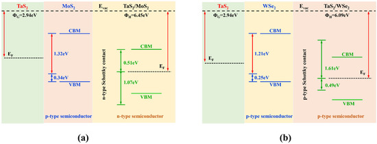 The band structure of TaS2/MoS2, TaS2/WSe2 vdWHs is shown in Figure 3. TaS2 and MoS2 (WSe2) maintain their intrinsic band structure while forming heterostructures. The metal properties of the TaS2 monolayer and semiconductor properties of the MoS2 (WSe2) monolayer are well preserved. In metal/semiconductor contacts, it is important to determine whether ShC or OhC contacts [48] are formed, reducing the Schottky barrier and improving charge injection efficiency. The weight band structure in Figure 3a,b showed that TaS2/MoS2 and TaS2/WSe2 vdWHs all formed Schottky contacts, and we found that the bandgap values of PBE were 1.58/1.63eV, respectively. It is well known that the Schottky barrier heights (SBH) of the n-type and p-type are determined by the Schottky-Mott rule [49] as ΦBn = ECBM − EF and ΦBp = EF − EVBM, where the conduction band minimum (CBM), valence band maximum value (VBM), and Fermi level are defined by ECBM, EVBM, and EF, respectively. In addition, to confirm the formation of the Schottky contacts in such heterostructures [48], we further plot the work functions of metallic TaS2, semiconducting MoS2(WSe2) monolayers, and their corresponding vdWHs, as displayed in Figure 4a,b. The n-ShC SBH of TaS2/MoS2 vdWHs was 0.5 eV, and the p-ShC SBH of TaS2/WSe2 vdWHs was 0.49 eV. Notably, the SBH of TaS2/MoS2(WSe2) vdWHs is very small, indicating that the MoS2(WSe2) material can be considered an efficient 2D metal contact with the TaS2 material.