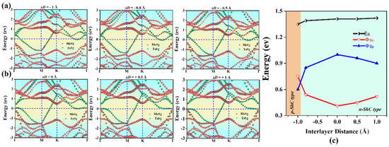 Projected band structures of TaS2/MoS2 vdWHs at different interlayer distances in (a,b). The MoS2 and TaS2 layers in (a) are separated by red and green circles, respectively. (c) Evolution of the contact barrier in the TaS2/MoS2 heterostructure at different interlayer distances.