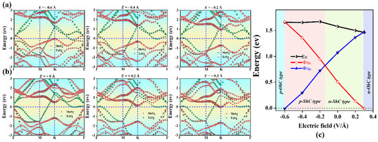 Furthermore, we considered the effect of the electric field on the electronic properties and contact types of TaS2/MoS2 (WSe2) vdWHs, as shown in Figure 8 and Figure 9. It can be observed that the SBH of TaS2/MoS2 (WSe2) vdWHs changes linearly with the electric field. Here, the applied electric field is applied in the z direction of vdWHs. As shown in Figure 8a,b, for TaS2/MoS2 vdWHs, by applying a positive electric field, the CBM of the MoS2 layer moves down to the Fermi level, resulting in a decrease in ΦBn. Instead, VBM moves downward away from the Fermi level, causing ΦBp to increase. Interestingly, changes in SBH and contact types can be seen in Figure 8c. When a positive electric field of 0 < E < 0.3 V/Å is applied, it can be seen that ΦBp > ΦBn. In this case, the n-ShC type exists for 1T-TaS2/2H-MoS2 vdWHs. Surprisingly, when a positive electric field of E ≥ 0.3 V/Å is applied, it is found that the CBM of MoS2 moves down through the Fermi level and can form a transition from the n-ShC type to n-OhC type in TaS2/MoS2 vdWHs. Similarly, when a negative electric field of −0.14 < E ≤ 0 Å is applied, it can be found that ΦBp > ΦBn. In this case, the n-ShC type still exists for TaS2/MoS2 vdWHs. However, when a negative electric field of −0.6 < E ≤ −0.14 Å is applied, it can be observed that ΦBn is gradually larger than ΦBp, indicating that TaS2/MoS2 vdWHs can form a transition from the n-ShC type to p-ShC type. In addition, when a negative electric field of E ≤ −0.6 V/Å is applied, it can be found from the figure that the VBM of MoS2 moves upward through the Fermi level, forming a transition from the p-ShC type to p-OhC type. Similarly, as shown in Figure 9a,b, for TaS2/WSe2 vdWHs, the CBM of the WSe2 layer moves upward away from the Fermi level by applying a positive electric field, resulting in an increase in ΦBn. In contrast, VBM moves upward towards the Fermi level, resulting in a decrease in ΦBp.