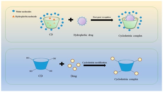 CDs generally integrate a hydrophobic cavity and a hydrophilic outer surface, which enables the inclusion of various hydrophobic bioactive agents with an appropriate size in the cavity for enhanced solubility and bioavailability via supramolecular host–guest interactions [25,26].