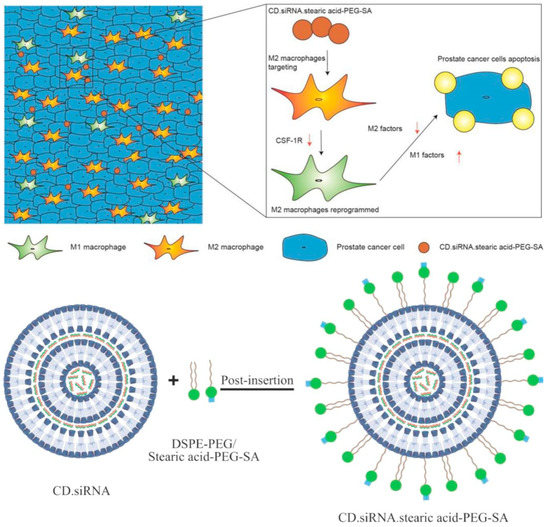 A graphical summary of the pathway (above) and a schematic of the formulation of the M2 macrophage-targeting NP CD.siRNA.stearic acid-PEG-SA prepared by incorporating the ligand stearic acid-PEG-SA into CD.siRNA formulation using a post-insertion approach (below) (Sun et al. [34]).