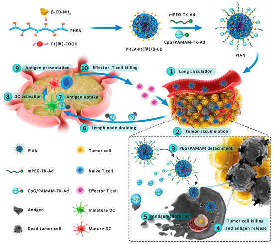 In the field of tumor vaccines, Zhang et al. reported a supramolecular assembly programmable nanodrug (PIAN) as an in situ cancer vaccine. PIAN is fabricated via β-CD/Ad host–guest interactions among PPCD, mPEG TK Ad (PEG thione adamantane) and CpG/polyamide amine thione adamantane (CpG/PAMAM-TK Ad). After being injected intravenously into the body, the vaccine first circulates in the blood and then flows through tumor tissue. Then, accumulation begins in the tumor tissue through the EPR effect. Then, due to the high ROS of the tumor microenvironment, CpG/PAMAM and PEG are separated. The ingestion of PPCD in vaccines by tumor tissue leads to tumor cell death and antigen release. The released antigen is captured by CpG/PAMAM, forming a complex, and then reached the tumor-draining lymph nodes (TdLNS). Then, dendritic cells (DC) internalize CpG/PAMAM/antigens, leading to activation within the DCs. Activated DCs present antigens to T cells, and ultimately tumor-specific effector T cells return to the tumor site to exert anti-tumor effects [37] (Figure 4).