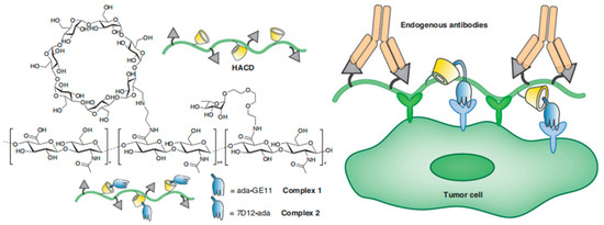 Antibody recruitment molecule (ARM) immunotherapy is a promising tumor treatment strategy that has the dual characteristics of recruiting endogenous antibodies and targeting tumors [39,40]. The antibody terminal (ABT) of ARM is usually a hapten such as L-neneneba rhamnose (Rha) or 2,4-dinitrophenol (DNP), which mainly binds to endogenous antibodies in human serum. The tumor binding terminal (TBT) acts as a targeted tumor [41]. Based on this, Zheng et al. reported multivalent antibody recruitment molecules (ARMs) with dual targeting tumor terminal (TBT), including hyaluronic acid (natural ligand targeting CD44) targeting clustered 44 (CD44, a transmembrane glycoprotein, overexpressed in breast cancer and triple negative breast cancer) and nano antibody 7D12 or peptide GE11.7D12 targeting epidermal growth factor receptor (EGFR, overexpressed in tumor cells). GE11 is attached to polyvalent rhamnose via host–guest recognition β- CD-grafted hyaluronic acid (HACD) to form macromolecular complexes. By dual targeting and recruiting Rha antibodies, cytotoxicity against target tumors is generated, providing direction for future ARM strategies with dual specificity [42] (Figure 6).