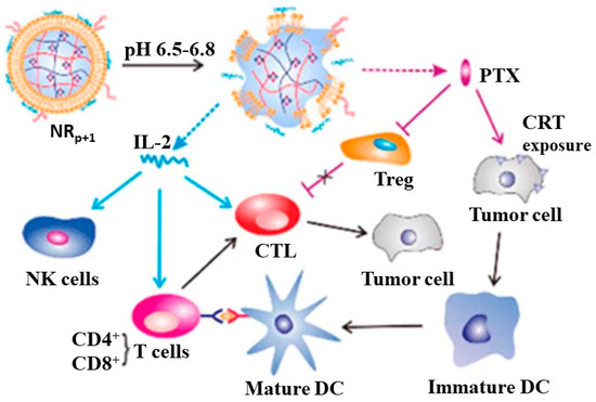 Chemotherapy drugs are extensively employed in cancer treatment [45]. Some chemotherapy drugs can induce immunogenic death of tumor cells, which involves the release of antigens from tumor cells, uptake and presentation by DC cells, and activation of cytotoxic T lymphocytes [46,47]. Paclitaxel (PTX) is a commonly used broad-spectrum chemotherapy drug with poor water solubility. Some studies have shown that low-dose PTX can regulate the immunosuppressive tumor microenvironment to improve the immunotherapeutic effect of cytokines. In addition, low-dose PTX can also expose calcium reticulin (CRT) on tumor cells, stimulate DC cells, and rebuild immune monitoring. IL-2 has been widely used as a cytokine approved for melanoma and renal cell carcinoma, but high doses of IL-2 have side effects. Therefore, reducing the dosage of IL-2 may avoid side effects, but low doses of IL-2 alone may not induce immune effector cells, so the binding of PTX and IL-2 is imperative. However, due to differences in physical and chemical properties and mechanisms of action, the two cannot be simply combined directly. Therefore, it is very urgent to develop a drug delivery platform that can simultaneously deliver PTX and IL-2. Song et al. constructed a responsive nano gel for the tumor microenvironment. Specifically, they first obtained methacrylamide N-(2-hydroxy) propyl-3-trimethylammonium chloride chitosan (HTCCm) with opposite charge as a nano gel. By regulating HTCCm, the responsiveness to weak acidic pH was generated. Then, they applied 2-hydroxypropyl-β-cyclodextrin-acrylate (HP-β-CD-A) to the gel system through photo-crosslinking, which can improve the encapsulation efficiency of PTX. In order to encapsulate IL-2 and to achieve the effect of protection and delivery, they further coated the red blood cell membrane (RBCm) on the nano gel (NG). The glycoprotein on the surface of RBCm can better combine with IL-2. This nano gel can better release drugs through response and facilitate a synergistic anti-tumor effect of chemotherapy and immunity [48] (Figure 7).