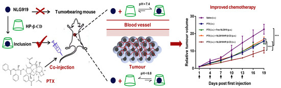Hence, it is imperative to have a drug carrier that exhibits facile loading of hydrophobic compounds, while simultaneously possessing commendable biocompatibility and minimal toxicity. CDs and their derivatives manifest exceptional characteristics that fulfill these prerequisites. Their hydrophobic internal cavities effortlessly encapsulate hydrophobic drugs, while the hydrophilic exterior surface enhances water solubility. In light of this, Xu J et al. conducted a comprehensive evaluation of the interaction between various CDs and NLG919, identifying the optimal carrier for NLG919 administration. Among these, HP-β-CD emerged as the most advantageous for facilitating NLG919 dissolution and subsequent intravenous injection. Furthermore, when combined with paclitaxel (PTX), the cytotoxicity toward tumor cells exhibited a substantial augmentation. Notably, the NLG919/HP-β-CD complex demonstrated heightened chemotherapeutic potency in synergy with PTX, thereby attaining immuno-chemotherapeutic synergy and amplifying the overall antitumor efficacy [60] (Figure 8).