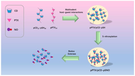 Schematic diagram of Poly(cyclodextrin)-drug nanocomplexes(pPTX/pCD-pSNO). (Kim J., et al. [61]).