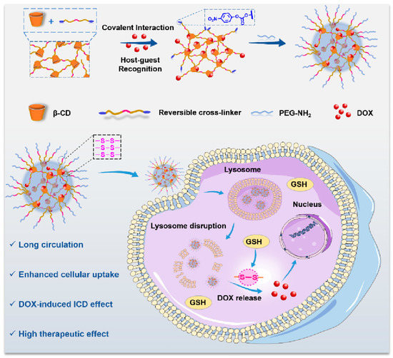 In terms of DOX, Hu et al. reported a GSH responsive supermolecule gold nanocage based on poly cyclodextrin. Because the high GSH state of the tumor microenvironment will lead to the coupling of chemotherapy drugs in the body with GSH, the drugs will then be discharged. The material was first synthesized as a crosslinker (DBHD) corresponding to GSH with p-nitrophenyl carbonate as the terminal group. The CD was covalently crosslinked with the crosslinker DBHD through a disulfide bond, and the GSH-sensitive poly cyclodextrin (PCD) was prepared. DOX can be coupled to the supermolecule gold nanocage of PCD through host–guest recognition. Finally, PEG-NH was introduced to stabilize the system (PDOP). Due to the introduction of PEG-NH, PDOP gold nanocages (NCs) have the characteristics of prolonging blood circulation and improving tumor accumulation. When the gold nanocage enters the tumor site, due to high GSH, the disulfide bond of the gold nanocage will be destroyed, and PDOPNCS will be dissociated. This gold nanocage prevents DOX from expelling tumor through GSH, enhances chemotherapy activity, and induces cell immune death (ICD), thus generating a synergistic effect of immunochemotherapy [63] (Figure 11).