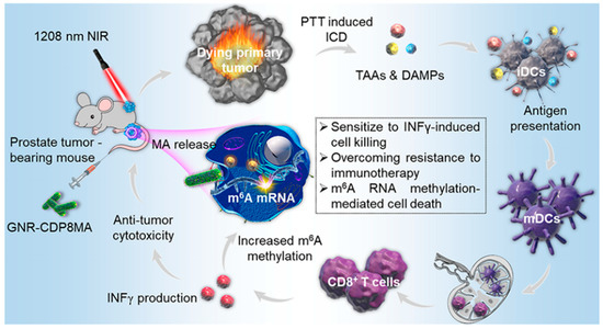 Liu J et al. designed a nanoplatform based on gold nanorods for NIR II-mediated photothermal therapy (PTT). N6 methyladenosine (m6A) demethylase inhibits prostate cancer targeting. For enhanced photothermal immunotherapy, they used polystyrene sulfonate as the interconnection layer, assembled GNR layer by layer, and then used a γ-CD crosslinked low molecular weight polyethylene imide cationic polymer coating, which is related to targeting prostate cancer. An eight-polymer peptide was allowed to bind to a specific gastrin-releasing peptide receptor. Then, the m6ARNA demethylase inhibitor mellofenac (MA) was loaded into the CD cavity through hydrophobic interaction. GNRCDP8MA specifically targets prostate cancer cells and selectively aggregates at tumor sites in vivo. In addition, under 1208 nm laser irradiation, GNR-CDP8MA almost completely eliminated prostate cancer cell-derived tumors. In the mechanism, NIR-II triggers GNRCDP8MA to release MA, which increases the methylation of mRNAm6A and reduces the stability of PD-L1 transcript. In addition, PTT mediated by GNRCDP8MA induces the death of immunogenic cells in primary tumors, thereby enhancing anti-tumor immunity by activating antigen-presenting dendritic cells and tumor-specific effector T cells in metastatic tumors [67] (Figure 12).