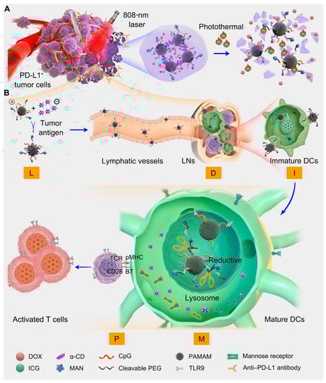 (A) Fabrication of the integrated regimen and the release process of CpG-P-ss-M. (B) Simplified mechanism of CpG-P-ss-M–mediated DC maturation for cancer immunotherapy. Letters LDIMP in orange frame represent loading tumor-specific antigens by DDS, draining to LNs, internalization by DCs, DC maturation for costimulatory molecule expression, and presenting peptide–MHC-I complexes to T cells, respectively. (Qin, L. et al. [68]).
