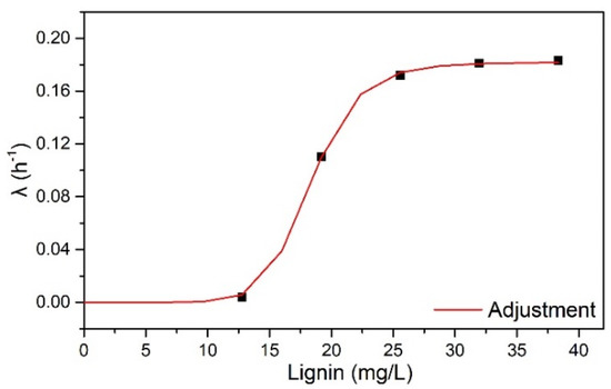 The dependence of λ on L was fitted by a simple exponential function (Equation (1)), valid up to 40 mg/mL of lignin. The OriginPro 8.0 Software Levenberg–Marquardt algorithm (OriginLab, Northampton, MA, USA) estimated the following parameters: λmax—0.1817 h−1, n—9.45, k—18.354 h−1, and R2—0.999.
