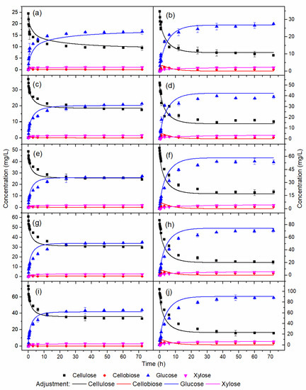 In Figure 2a, although the model represented the trend of the experimental profiles for the assay with 4% w/v HB in the initial hours of hydrolysis, it exhibited a simulated glucose profile slightly below the experimental profile. In addition, the simulated cellulose profile was slightly overestimated compared to the experimental.