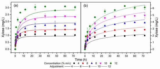Xylose temporal profiles for (a) HB and (b) OB at different concentrations.