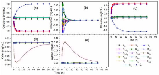 Effects of the kinetic parameters: (a) cellulose, (b) cellobiose, (c) glucose, (d) xylan, (e) xylose concentration.