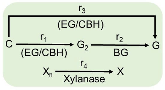 where C, G2, G, Xn, and X are the concentrations (mg/mL), t is the reaction time (h), and r1, r2, r3, and r4 are the reaction rates (mg/mL h). In Equations (3), (4) and (6), 1.056, 1.111, 1.053, and 1.136 are the stoichiometric factors of the reactions; 1.056 is the cellulose to cellobiose conversion factor, 1.111 is the cellulose to glucose conversion factor, 1.053 is the cellobiose to glucose conversion factor, and 1.136 is the xylan to xylose conversion factor.