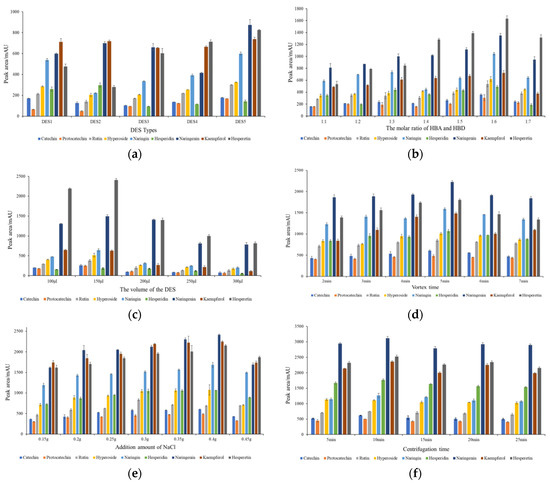 The results of the effect of the types of DES (a), the molar ratio of HBA and HBD (b), the volume of the DES (c), vortex time (d), the addition amount of NaCl (e) and centrifugation time (f).