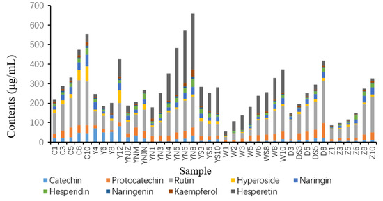 The composition of 9 flavonoids in 40 vinegar samples of 5 brands was analyzed. The examined flavonoids included catechin, protocatechin, rutin, hyperin, naringin, hesperidin, hesperidin, kaempferol and hesperidin. Variations in the dominant flavonoids among the test samples could be attributed to the dissimilarities in raw materials, acidity levels and production processes (Figure 4). Insights into brand-specific trends showed increased flavonoid contents corresponding with the rise in Shanxi aged vinegar’s (SAV) aging time. Brands Y and C, notably, demonstrated higher flavonoid content than the other brands. A comparative analysis between Brands Y and C revealed a similar concentration of catechin, procatechin and naringenin. However, Brand C exhibited a clear dominance in rutin, hyperoside and naringin concentrations over Brand Y. In contrast, the content of hesperidin, hesperetin and kaempferol was markedly elevated in Brand Y compared to Brand C. Further, the content of hesperetin was the highest in brand Y, followed by brand D, with significantly higher levels than the remaining brands. With the progressive increase in SAV’s aging years, a concurrent rise in hesperetin content was recorded across all five brands. Similarly, brand C displayed the highest rutin content, which was also relatively high in the other four brands. A decreasing trend in rutin content was noticed with the reduction in brand C’s ageing year, a pattern also reflected in the other brands. The graphical representation via column histograms (Figure 4) highlighted the peak flavone content in YN8 at approximately 657.95 μg/mL. Compared with other samples, the W1 sample demonstrated significantly lower total flavonoid content, measuring 54.77 μg/mL. As an individual flavonoid, rutin exhibited exceptionally high content across all samples, ranging between 16.32 μg/mL to 232.068 μg/mL.