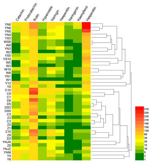 In Figure 5, a comparison of the contents of nine flavonoids in 40 samples is presented using a heat map. Each row within the graphic denotes a unique sample of SAV, and each column corresponds to a distinct flavonoid compound. High and low levels are depicted by red and green hues, respectively. The heat map facilitates a detailed analysis of the variations in flavonoid compounds across different brands and maturity levels of vinegar samples. The significant clustering suggests a high degree of similarity in flavonoid expression patterns amongst specific samples. Notably, the YN8, YN6 and YN5 samples displayed pronounced clustering, signifying an exceptionally high hesperetin content. Likewise, samples C10 and C8 manifested a distinct clustering pattern with a notably elevated rutin content. Upon close examination of Figure 5, it was observed that the concentrations of naringenin and kaempferol were generally lower across all samples. Broadly, samples from the same brand tended to cluster together, implying a relative consistency in the expression characteristics of flavonoids within each brand. This observation further substantiated the hypothesis that the characteristic flavonoids in a sample are influenced by the raw materials used, the processing methods employed and the sample’s acidity.