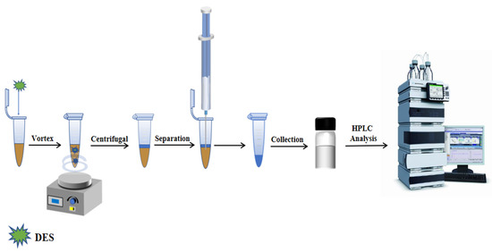 We accurately measured 3.5 mL of the diluted sample solution and transferred it into a 10 mL centrifuge tube. Then, 150 μL DES5 and 0.40 g NaCl were added to the solution. The tube was placed in a vortex mixer for 5 min to reach extraction equilibrium. Afterwards, the tube was centrifuged at 5000 r/min for 10 min. The lower aqueous phase was extracted and discarded using a syringe, while the organic phase was collected using a long needle and passed through a 0.22 μm organic filter membrane. The resulting organic solution was analyzed using HPLC. The VALLME-HPLC procedure is illustrated in Figure 6.