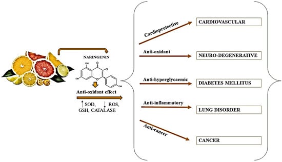 Since ancient times, citrus fruits have been utilized as natural herbal treatments in traditional medicine. Citrus peel has been utilized in traditional Chinese medicine to enhance digestion, minimize gastric gas, bloating, and clear congestion [12]. Clinical and epidemiologic research states that eating citrus fruits lowers the risk of lifestyle-related disorders like cancer, cardiovascular disease, diabetes (type-2), and osteoporosis [49]. Naringin has been shown to have anticancer, antiapoptotic, cholesterol-lowering, antiatherogenic, and metal binding capabilities, as well as antioxidant qualities, as shown in Figure 4. Naringin is also said to enhance medication absorption and metabolism [50].