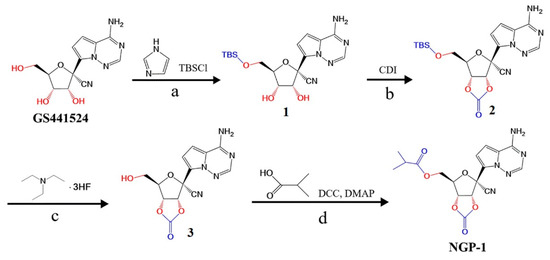 Synthetic route of NGP-1, a prodrug of GS441524, with potential anti-SARS-CoV-2 activity. Reagents and conditions: (a) 50 mL DMF, 0 °C, 1 h; (b) 100 mL ACN, 45 °C, 1 h; (c) 20 mL THF, 0 °C, 4 h; (d) 10 mL DMF, 8 h.