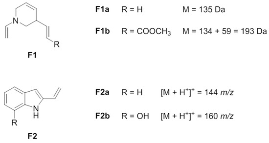 Compound 2, venalstonine (PubChem NSC180520), exhibited the ion [M + H+-NH3]+ = 320 m/z as peak base; due to the -COOCH3 moiety, the characteristic loss of 135 discussed above appears as the loss of 193 mass units (see Figure 3, F1b). Another fragment at 260 m/z was likely due to the loss of the same group as HCOOCH3, as shown in Figure S2.