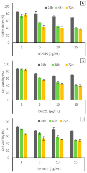 Cell viability analysis in SUP-B15 cells treated with IG2019 (A), IG2021 (B), and RM2019 (C) at 24, 48, and 72 h. All experiments were performed in triplicate and the data are expressed as mean ± SD values.