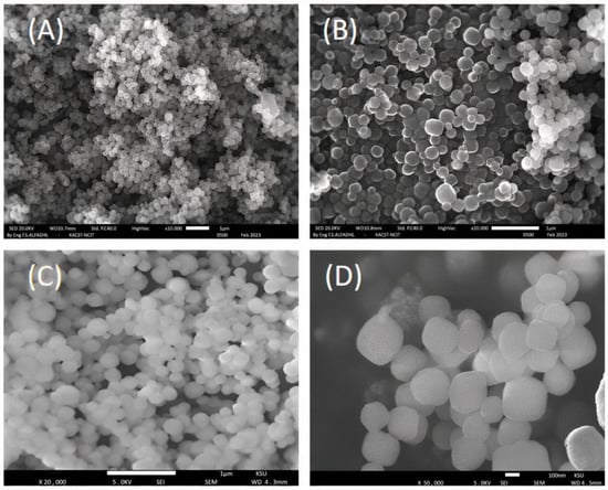 Images of prepared mesoporous silica nanoparticles using SEM technique: (A) unmodified MSNs (magnification 1 µm); (B) phosphate-modified silica nanoparticles (magnification 1 µm); (C) unmodified MSNs (magnification 1 µm); (D) polyphosphate-modified silica nanoparticles (magnification 100 nm).