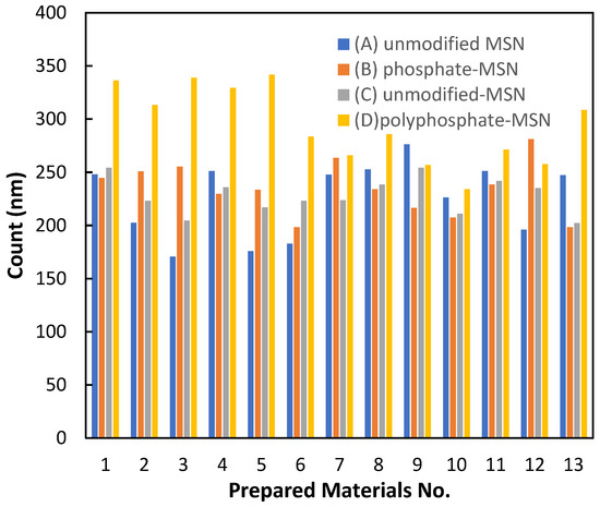 The particle sizes in SEM images were analyzed using ImageJ software, as shown in Figure 2. The results indicated that unmodified MSNs have an average particle size of 225 nm, while phosphate-modified silica nanoparticles have an average particle size of 234 nm, which is expected due to MSN functionalization (the size of length of the functionalized particles is 9 nm higher). In addition, the results show that polyphosphate-modified silica nanoparticles have an average particle size of 294 nm due to the polymer growth chain (the size of the polymer chain is 69 nm which is 7–8 repeat units).